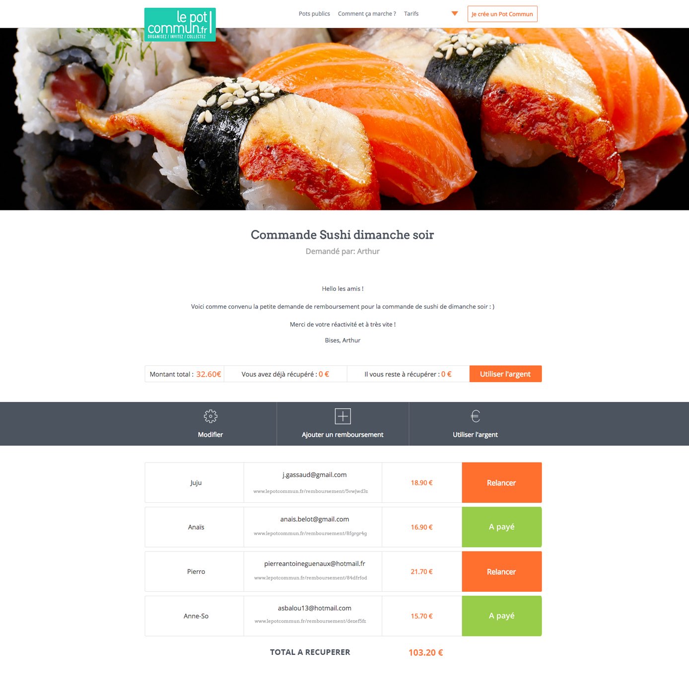 Les comptes entre amis, notamment dans le cadre d'un cadeau de groupe, amènent parfois des petits oublis et contrariétés, et c'est pour cette raison que le Pot Commun apporte un vrai plus dans l'organisation de vos budgets communs. Dans le cadre de vacances, d'un week-end à la campagne, d'un cadeau commun ou d'un voyage à plusieurs, ce site vous permet de répartir équitablement le budget et de faire en sorte que l'organisateur récupère les participations de ses amis, avec un système simple de relance. Fini les problèmes de remboursement ! Créez sans attendre votre cagnotte en ligne, ça change vraiment la façon de voir les choses et l'organisation des budgets entre amis... Faites-vous remboursemer en quelques clics !!